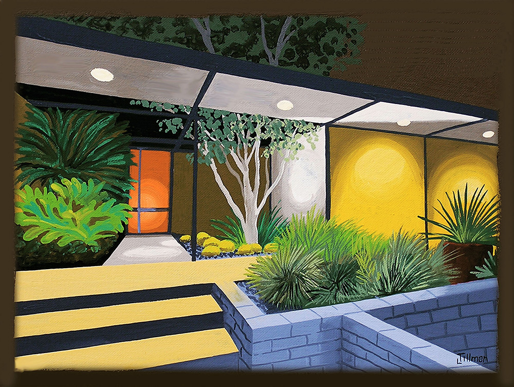 A graduate of Syracuse University School of Art and New York University, I have been a textile, apparel and home products designer for three decades, working in the New York and Los Angeles garment and design districts. I began painting canvases in 2004 and have experimented with various styles. I started with a series of large expressionist botanicals and have since moved on to more illustrative studies of mid century modern themes. As a long time collector of Eames Era furnishings, I find the subjects fun and inspiring. I like to add my own twist to the sometimes stark Eames elements by posing pets in the settings. I am also intrigued by the futuristic space age themes from the period, and like to add mystery and humor to my works.